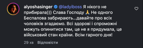 – Я нікого не усувала. Дякувати Богу. Забирають не лише Беспалова. Згадаймо про всіх чоловіків. Всі здорові та придатні можуть опинитися там, це не я вигадала, це воєнний стан в державі. Всім хорошого дня! – написала Тополя.