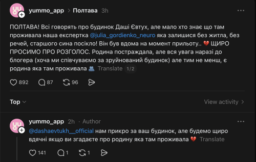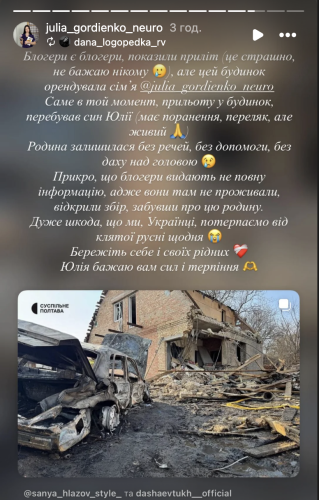 – Полтава! Усі обговорюють будинок Даші Євтух, але мало хто знає, що там жила наша експертка Юлія Гордієнко, яка опинилася без даху над головою, без майна, а її старшого сина поранено! Він був вдома під час прильоту. Дуже просимо про поширення інформації. Родина постраждала, але вся увага зараз прикута до блогера (хоча ми висловлюємо співчуття з приводу зруйнованого будинку), але все ж таки, є сім’я, яка там жила, – зазначено в повідомленні.