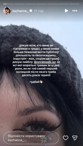 – У мене більше немає натхнення займатися публічною діяльністю та створювати музику. Сфера — жах, суспільство ще гірше. Щиро дякую лейблу Nova Music за всі мої психологічні травми за ці два роки, ви як той самий перший колишній, після якого потрібні десять років психологічної допомоги, — написала Кажанна в сторіс Instagram.