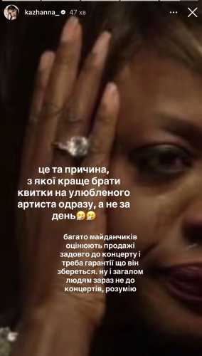 – Через певні технічні питання ми були змушені відмінити виступи в Одесі, Дніпрі та Полтаві. Це рішення далося нам нелегко, але воно є необхідним… Саме з цієї причини варто купувати квитки на улюбленого виконавця завчасно, а не в останній момент. Велика кількість майданчиків оцінюють обсяги продажів задовго до проведення заходу, і їм потрібні гарантії, що на нього збереться достатня кількість людей. Ну і, звичайно, зараз багатьом людям не до розваг, я це розумію, – пояснила Кажанна.