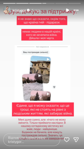 – В нашому котеджному містечку всі вціліли, люди – найдорожче. Будинок ще не бачила, але говорять, що має серйозні пошкодження. Очевидно, ця історія мала так закінчитись. І ось міркую, чи стало б мені легше, якби цей будинок ми все ж таки реалізували нещодавно, і лихо трапилось би з новими господарями, ні, не стало б… щойно говорила з мамою про це. Тут і так, і так не просто, відверто кажучи. Але насправді, ніхто не може гарантувати, що ракета не влучить будь-куди, – написала вона.