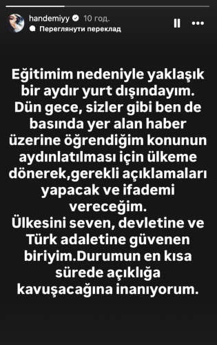 – У зв’язку з моїм навчанням я вже близько місяця перебуваю за кордоном. Вчора ввечері, як і ви, я дізналася з новин про цю ситуацію. Щоб прояснити обставини, я повернуся до своєї країни, зроблю необхідні заяви та надам свідчення. Я людина, яка любить свою державу, довіряє країні та турецькому правосуддю. Вірю, що ситуація якнайшвидше проясниться, – зазначила акторка.