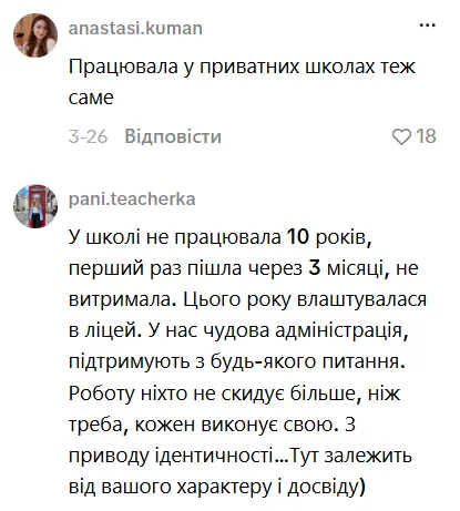 Інші ж підтвердили слова педагогині, зауваживши, що аналогічні труднощі наявні не тільки в державних, але і в приватних школах. Частина користувачів підкреслила: ключову роль відіграє колектив і управління.