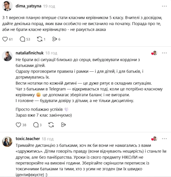Український викладач звернувся до товаришів по фаху та зацікавлених у Threads з проханням поділитися настановами перед початком класного керівництва. У відповідь він отримав безліч корисних, а часом і незвичайних рекомендацій.