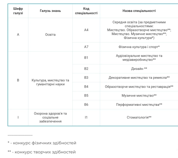 На які спеціалізації необхідно проходити креативний іспит / скриншот