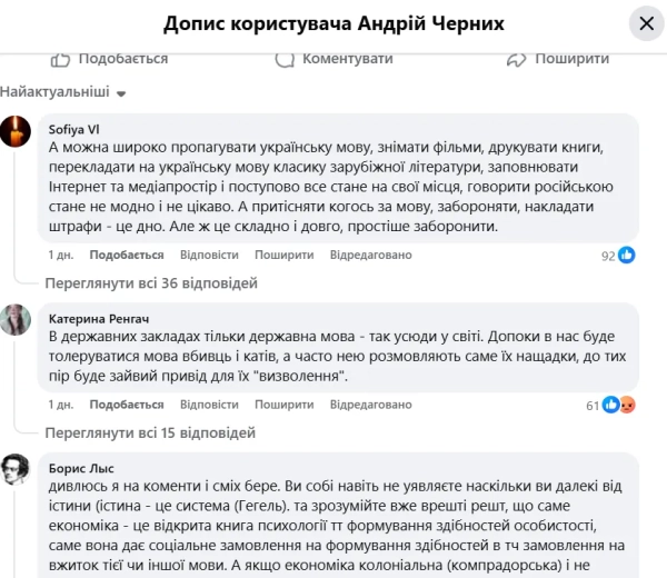 З іншого боку, українці під дописом Андрія Черниха у Facebook розпочали обговорення щодо заяви заступниці керівника МОН.