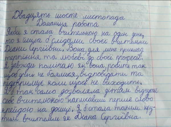 Завершила своє есе школярка словами: вона прагне стати “таким крутим вчителем, як Діана Сергіївна”.