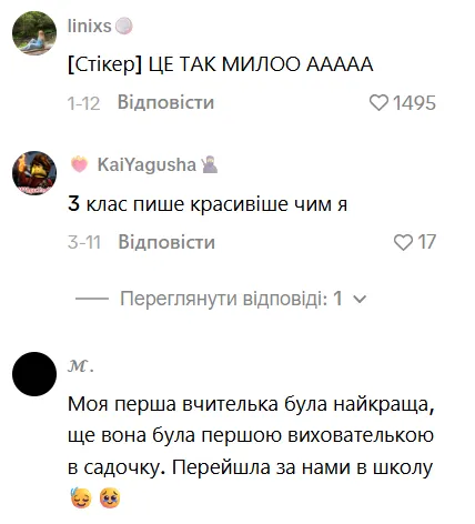 Окрему увагу привернуло слово “вчителюкою”, котре використала учениця. Відвідувачі сприйняли це з гумором, назвавши помилку милою та щирою. Водночас більшість дійшла згоди: основне – не ідеальна граматика, а те, що дитина відчуває заохочення та натхнення.