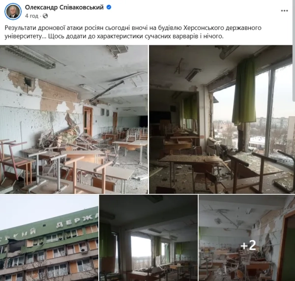 - Російські безпілотники завдали шкоди споруді Херсонського національного університету.