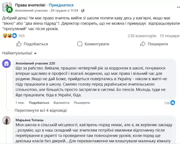 Що за кріпацтво. Переїхали, працюю четвертий рік за кордоном у школі, почуваюся вперше щасливо в професії та взагалі людиною, яка має права і особистий час для сім’ї. Якщо, не дай Боже, доведеться повертатись в Україну – ніколи в житті не піду працювати в школу. Схиляю голову перед українською викладацькою спільнотою, але більшість просто загрузли в системі. Бо пенсія. Молодь туди не йде працювати, лихо в Україні, лихо.